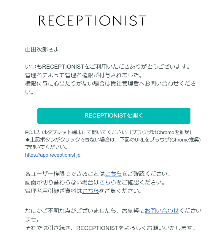 件名:[RECEPTIONIST]管理者権限が付与されました