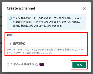 2. チャンネルの名前を入力し、「次へ」をクリック