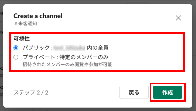 3. チャンネルの可視性を選択し、「作成」をクリック