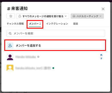 注意: 最後に「Slackとの連携設定」を行ったのが2023年10月19日以前の場合は、Botではなく「Slackとの連携設定」に使用した Slack 管理者アカウントがチャンネルに追加されているかをご確認ください。