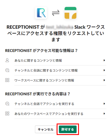 SlackとRECEPTIONISTの連携画面が表示されますので、「許可する」をクリックします。