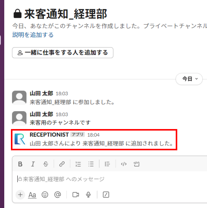 通知するチャンネルがプライベート(非公開チャンネル)の場合は、チャンネルにRECEPTIONIST Botを追加してください。