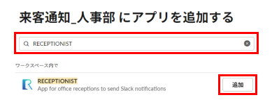 2.検索バーに「RECEPTIONIST」と入力し、RECEPTIONISTアプリの「追加」をクリックします。