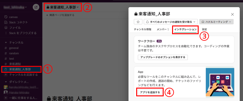 1.①通知先のチャンネルをクリック>②上部のチャンネル名をクリック>③タブ「インテグレーション」をクリック>④Appの「アプリを追加する」をクリックします。