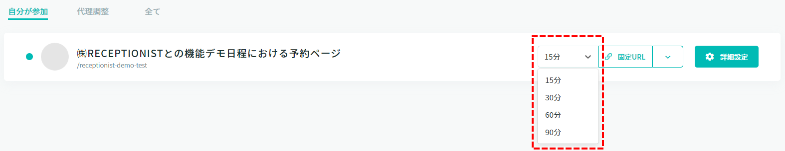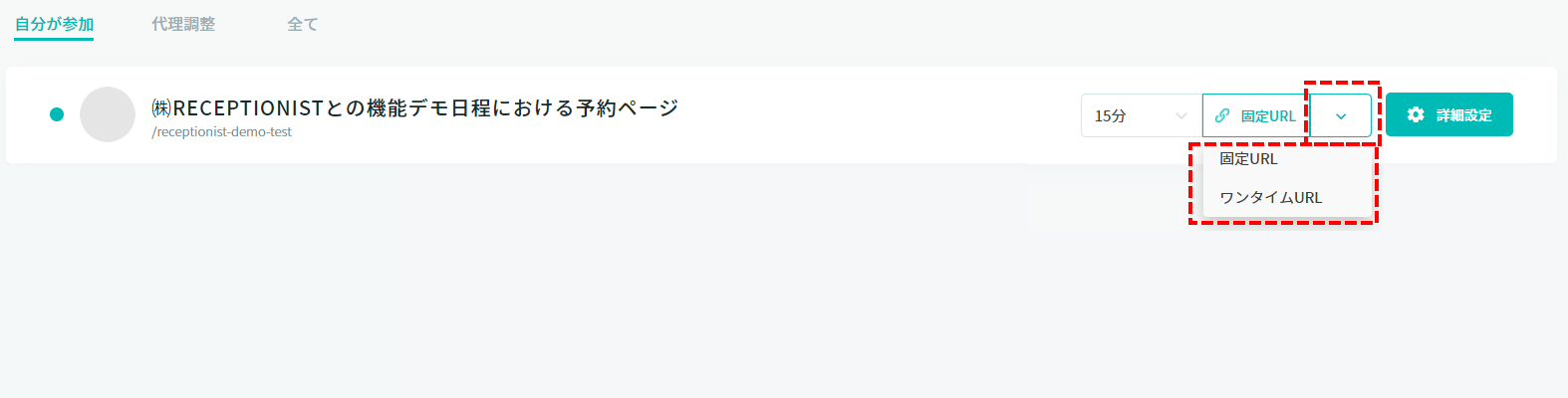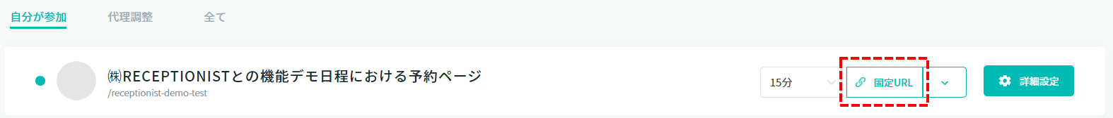 「予約一覧」をクリックすると、予約一覧に遷移します。 タブ「自分が参加」と「代理調整」のみ、「予約ページをコピー」をクリックすると、予約ページを複製します。