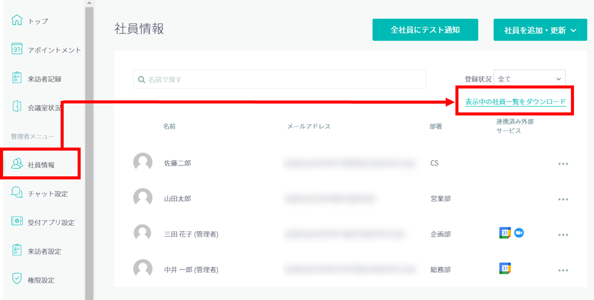 の左側メニューから「社員情報」をクリック、「表示中の社員一覧をダウンロード」をクリックするとCSVがダウンロードできます。