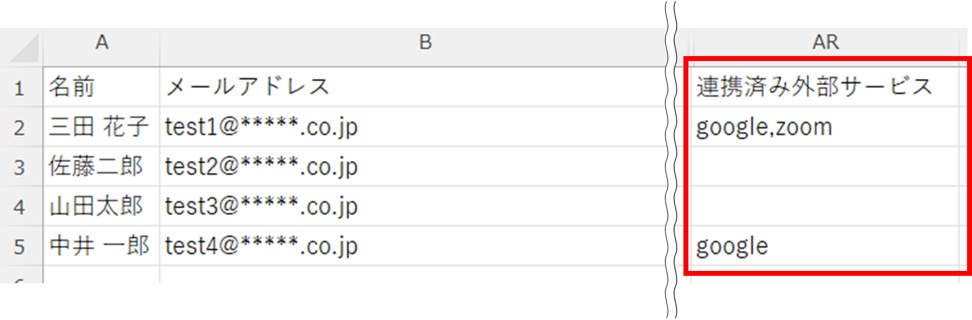 CSVの中の「連携済み外部サービス」に、外部連携しているサービスが記載されます。