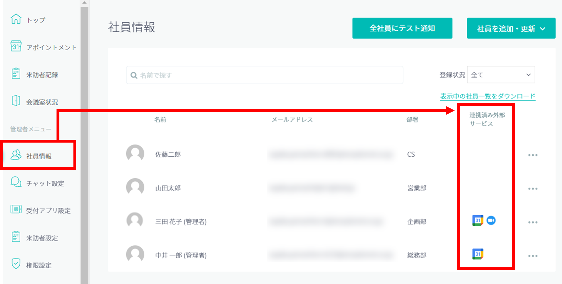 社員情報の一覧から、各社員の外部連携(Google Workspace、Microsoft 365、Garoon、Zoom、Webex)の連携状況を確認することができます。