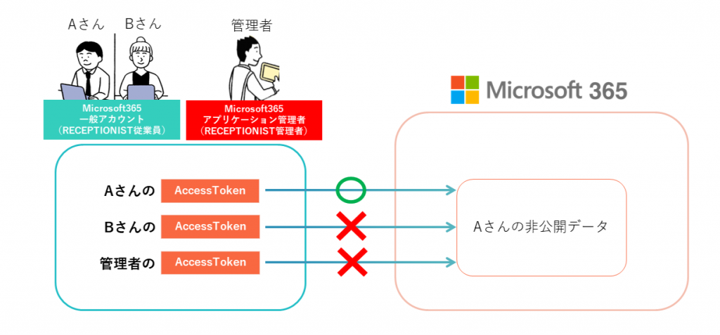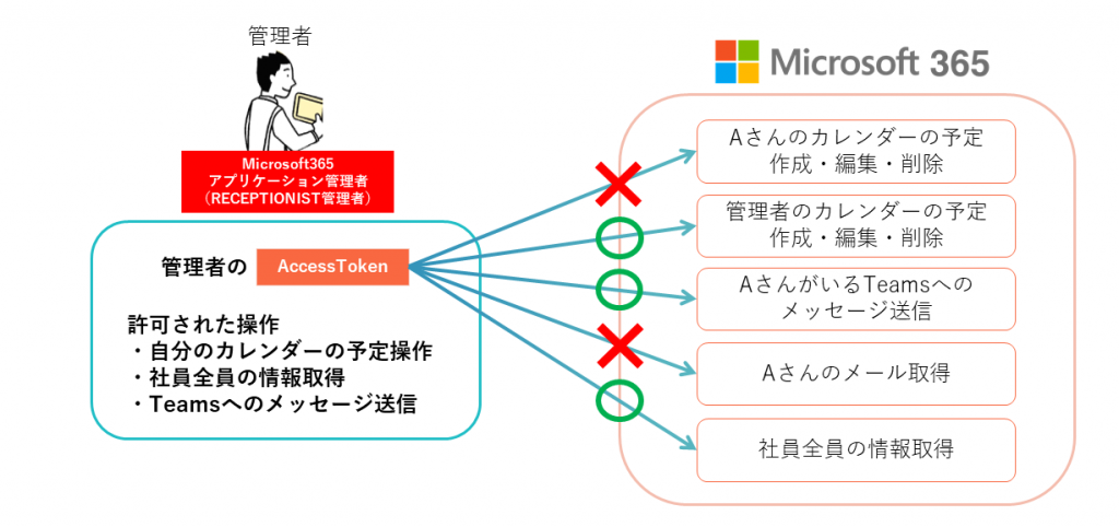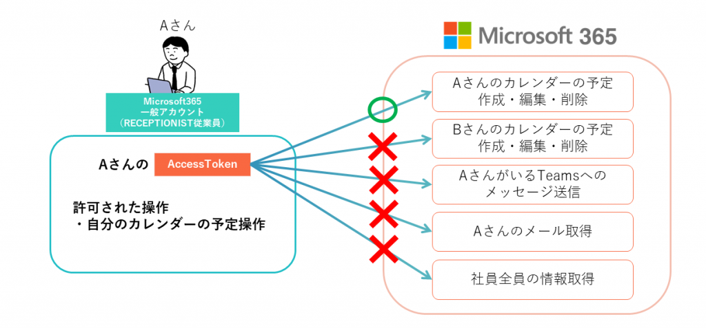Microsoft365と連携した際の権限制御の仕組みになります。AccessTokenは、認可したアカウントの権限に依存し、許可された操作のみ可能です。