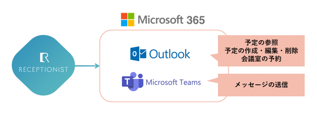 Microsoft365とシステム連携することで、Outlookカレンダーに予定の登録やMicrosoft Teamsにメッセージの送信ができます。