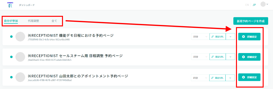 ダッシュボード画面で、左上のタブを選択して、予約ページの右側にある「詳細設定」をクリックします。