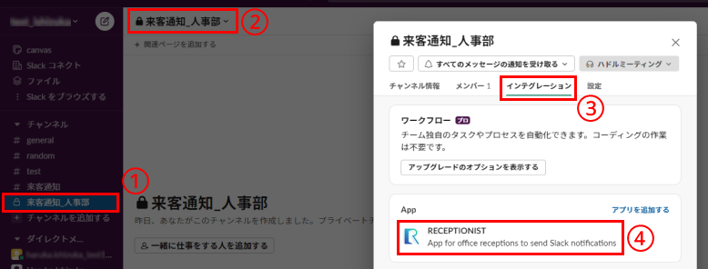 確認方法:①通知先のチャンネルをクリック>②上部のチャンネル名をクリック>③タブ「インテグレージョン」>④「App」に「RECEPTIONIST」が表示されているか