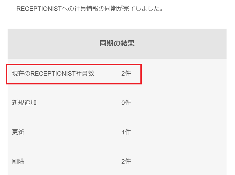 [2025/03/04] AzureAD(EntraID)連携時のメールに現在の社員数が表示されるようになりました。 2025年3月4日 アップデート日:2025/03/04 AzureAD(EntraID)連携後に届くメールに、同期後の登録社員数として「現在のRECEPTIONIST社員数」の項目が追加されました。社員数把握のための参考にご活用ください。 Check AzureAD(EntraID)連携はプレミアムプランでご利用いただけます。 (画像をクリックすると拡大表示します) 詳細は下記をご覧ください。 関連記事 Azure AD連携:社員情報の同期・一括更新(プレミアムプラン) | ヘルプセンター|クラウド受付システムRECEPTIONIST